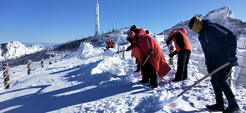 大雪足足下了兩天,給景區(qū)的清雪防滑工作造成了很大的壓力。此刻的天池游覽棧道已經(jīng)被大雪完全覆蓋,個別區(qū)域和通往衛(wèi)生間路段的積雪有一人多高。為了能讓天池景點盡早開放,主峰管理部經(jīng)理吳金明決定,先將衛(wèi)生間和B區(qū)游覽棧道清開1米寬,然后在不影響游客正常游覽的情況下,再拓寬至2米,以此來保證游覽棧道的最佳通行能力。