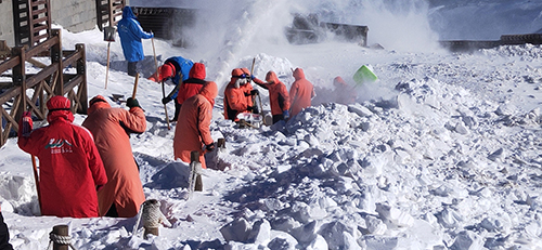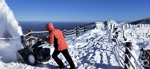 唱響浴雪戰(zhàn)歌,激蕩冬日暖流。25日上午9時,在主峰公路剛剛暢通的那一刻,20多名主峰管理部的男性員工第一時間抵達天池,他們片刻未停,立即投入了清雪工作。他們用手扶清雪機和雪鍬,將一塊塊厚重的積雪地拋到了雪墻外面。當時的氣溫在零下20多度,手凍僵了就揣在懷里暖暖,刺骨的寒風夾著冰雪硬塊,吹打在了他們的臉上,他們忍著疼痛繼續(xù)工作。一面是寒風呼嘯,冰雪覆蓋;一面是爭分奪秒,保障通行。當稍微休息一下的時候,就會凍得渾身發(fā)抖,但是大家互相鼓勵著,沒有一個員工叫累叫苦。