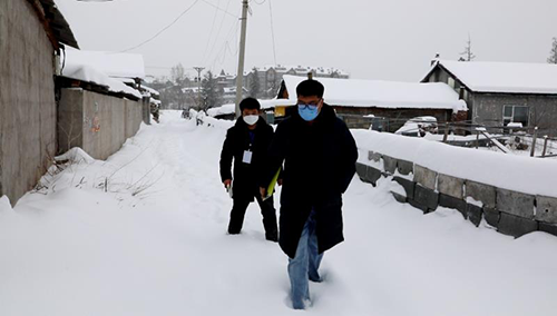 2月17日,長(zhǎng)白山地區(qū)迎來(lái)了入冬以來(lái)規(guī)模最大的一場(chǎng)大雪,這為第二天的排查工作增添了不小困難。清早,雪花還沒(méi)有停止,漫天白雪里,我們依然聽(tīng)到了“咯吱咯吱”的踩雪聲,原來(lái)股份公司的志愿者一早就已經(jīng)趟著膝蓋深的積雪,來(lái)到指定區(qū)域進(jìn)行入戶排查登記。天寒地凍、大雪紛飛,雪水濕透了襪子,寒風(fēng)刺痛著臉頰,也不能阻擋股份人和全區(qū)人民一道戰(zhàn)勝疫情的信念和決心。